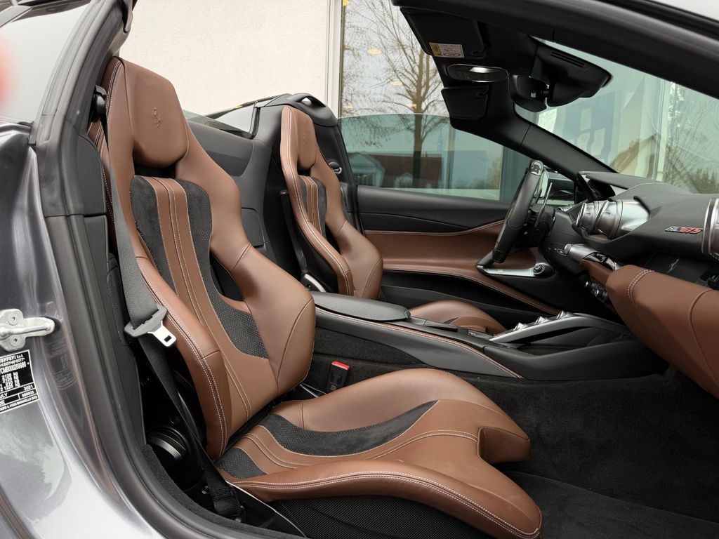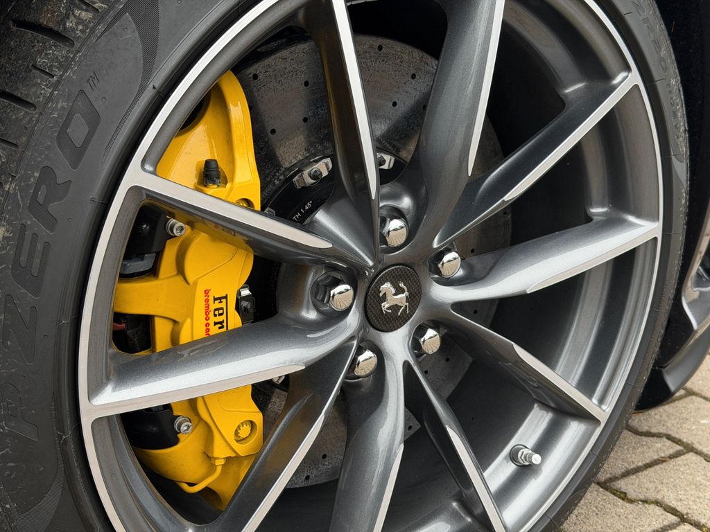 Sonderlackierung Extracampionario, Innenausstattung in Cioccolato, Teppiche Nero 152, Carbon-Racing-Sitze (Large), Alcantara-Dachhimmel Nero 9440, Carbon-Zone am Fahrerplatz inkl. LED-Beleuchtung, schwarze Lüftungsdüsen, spezielle Kontrastnähte (Cuciture speciali, Grigio Scuro 0318), gelber Drehzahlmesser, Beifahrerdisplay, Apple CarPlay, aufgewertetes HiFi-Soundsystem, Lift-System für die Vorderachse, elektrische Heckklappe, adaptive LED-Scheinwerfer mit SBL-Funktion, Advanced Front Driving Camera, Parkkamera, 20” geschmiedete Diamant-Felgen, gelbe Bremssättel, Scuderia Ferrari Embleme auf den Kotflügeln.